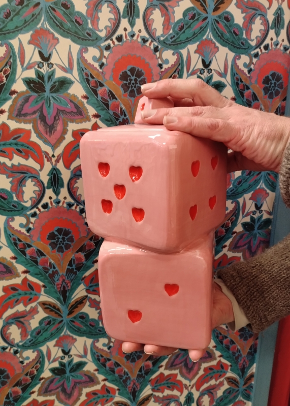 Breng een speels accent in je interieur met deze unieke pot in de vorm van dobbelstenen! Het zachte roze met rode stippen geeft een vrolijke twist aan elk hoekje in huis.