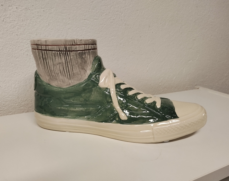Deze handgeschilderde vaas in de vorm van een sneaker schoen is een echte eyecatcher!