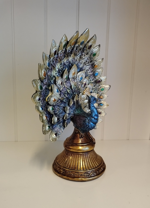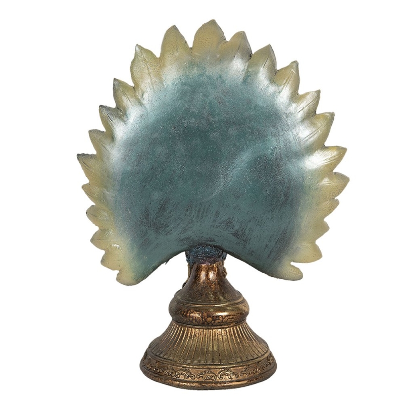 Dit is een kleurrijk en decoratief beeld van een prachtige pauw. Het heeft een opvallende, uitwaaierende staart met een rijkelijk patroon en details. De combinatie van blauwe en gouden tinten geeft het beeld een elegante en sierlijke uitstraling, waardoor het een mooi accent kan vormen in je woonruimte.