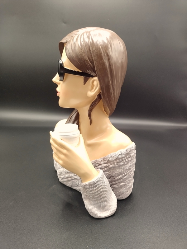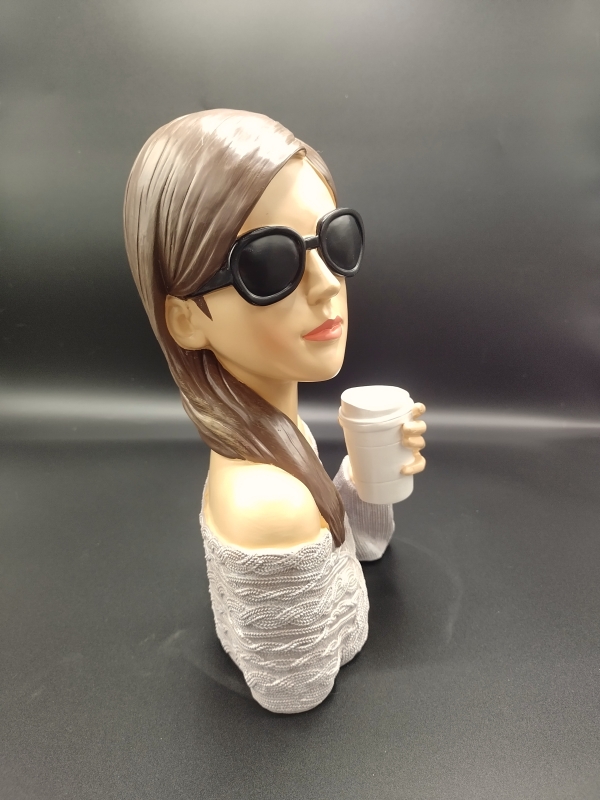 Dit is een prachtige sculptuur van een elegante dame. Het stuk is gemaakt van een hoogwaardig materiaal en heeft een stijlvolle, minimalistische uitstraling. De zonnebril geeft het werk een modern en chic accent. Deze sculptuur is een ware blikvanger en zal een mooie toevoeging zijn aan elke ruimte.