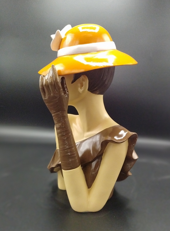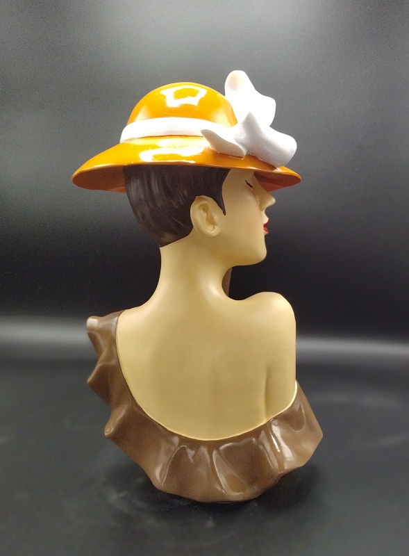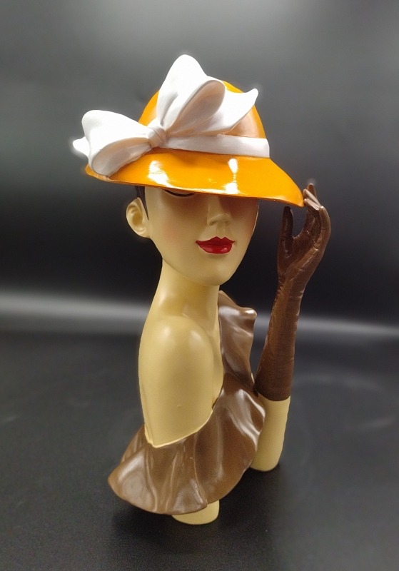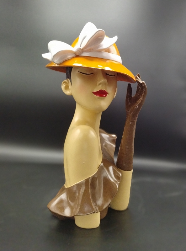 Dit is een prachtige sculptuur van een vrouw met een hoed. Het is gemaakt van polystone, een duurzaam materiaal, en heeft een warme bruine kleur. De sculptuur heeft een elegante en realistische uitstraling, waardoor ze een mooie toevoeging kan zijn aan elke ruimte.