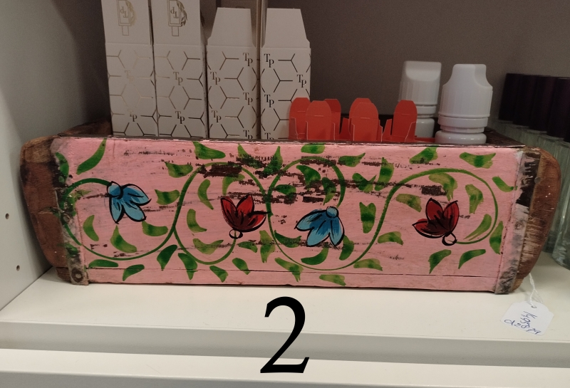 Houten steenmal, de handgeschilderde bloemen geven deze steenmallen een vrolijke uitstraling.