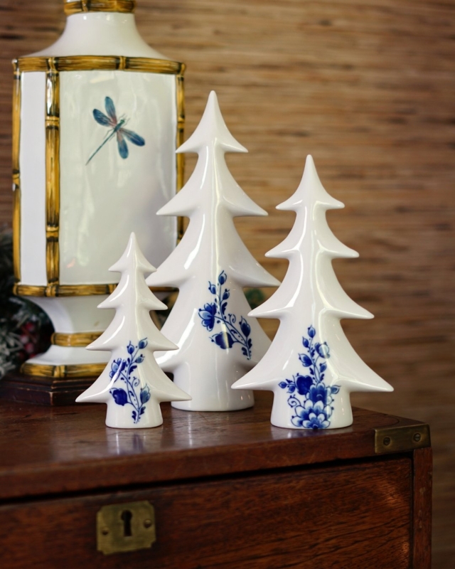 Een keramieken beeldje van een kerstboom met sierlijke takken en een subtiele Delfts blauwe decoratie. Voeg een beetje magie toe aan kerst dit jaar, met deze kerstdecoraties die rechtstreeks uit een witte wonderwereld lijken te komen. Sneeuwwit porselein wordt aangevuld met een Delfts blauwe bloesem die zich langzaam ontpopt tot een warme omhelzing. De statige kerstboom staat fier rechtop en heeft herkenbare kerstboomtakken. Op de onderste takken klimt een Delfts blauwe bloesem omhoog die de besneeuwde kerstboom wat kleur geeft. Combineer dit grote kerstboombeeld, met de andere maten.