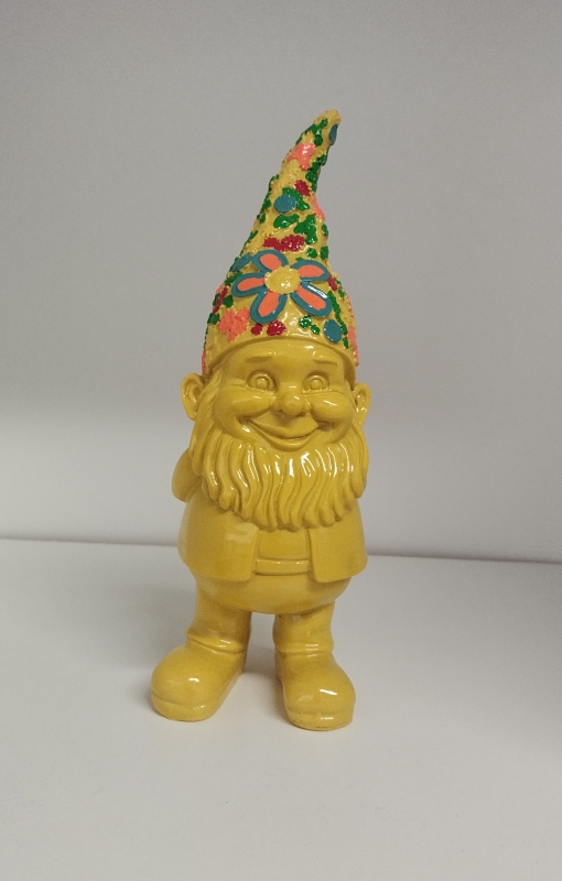 Dit kleurrijke kabouterbeeld is een charmante toevoeging aan elke ruimte.