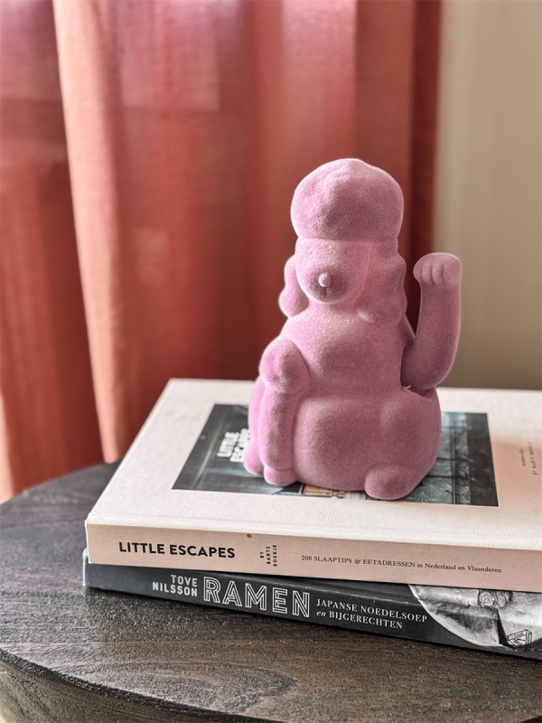 Met zijn opgeheven pootje lijkt hij vriendelijk te zwaaien en brengt hij een beetje extra geluk in elke ruimte.