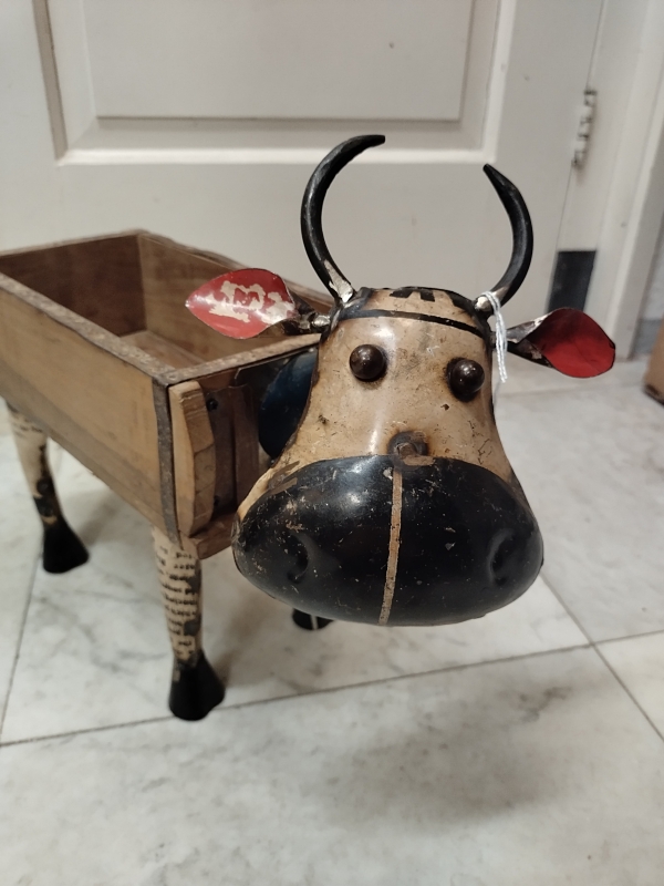 Grappige koe van oud blik met een lijf van een oude steenmal.