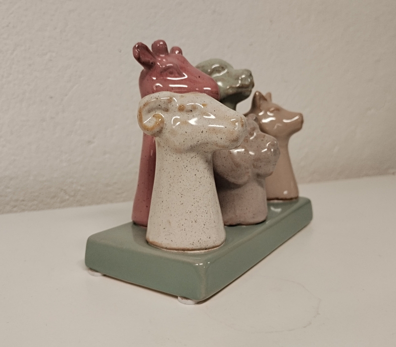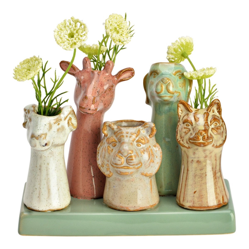 Vaasje van keramiek met verschillende dierenkoppen die zeker de aandacht trekken en een glimlach toveren op je gezicht.
