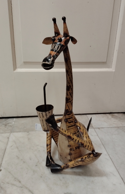 Grote zittende giraf met beker gemaakt van gerecycled blik.