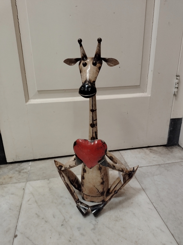 Grote zittende giraf met hart gemaakt van gerecycled blik.