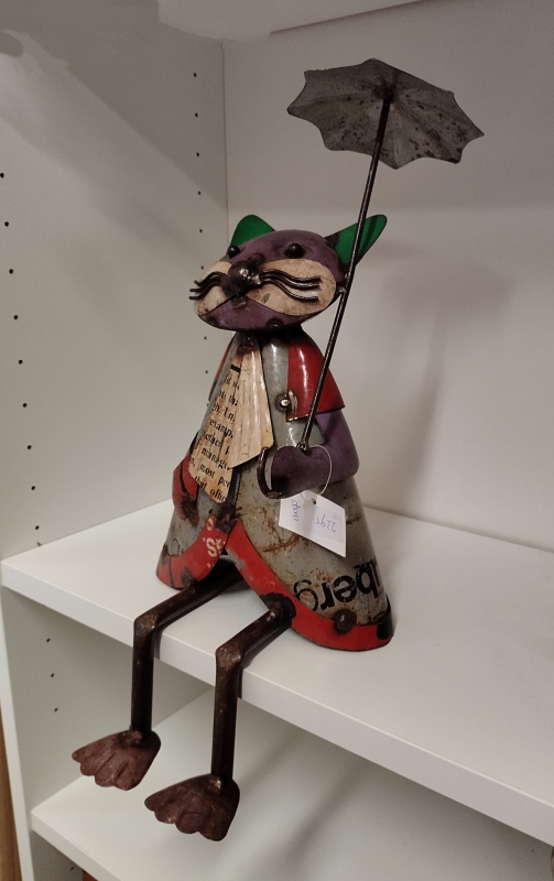 Zittende kat met paraplu gemaakt van gerecycled blik.
