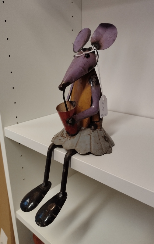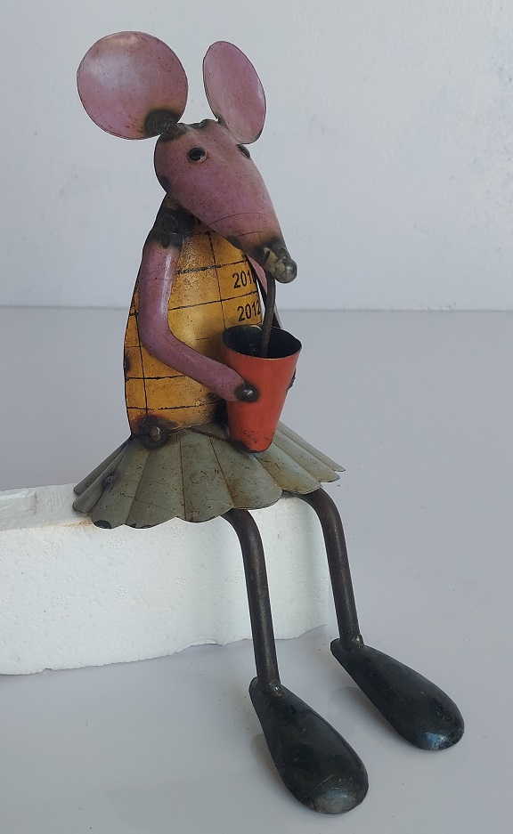 Zittende vrouwelijke muis met beker gemaakt van gerecycled blik.