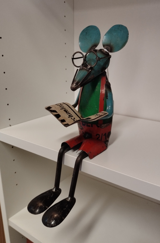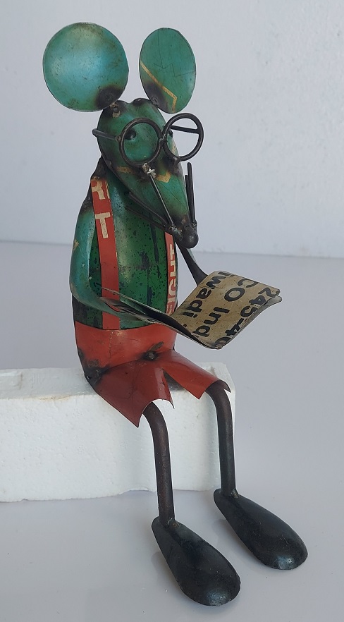 Zittende muis met boek en bril gemaakt van gerecycled blik.